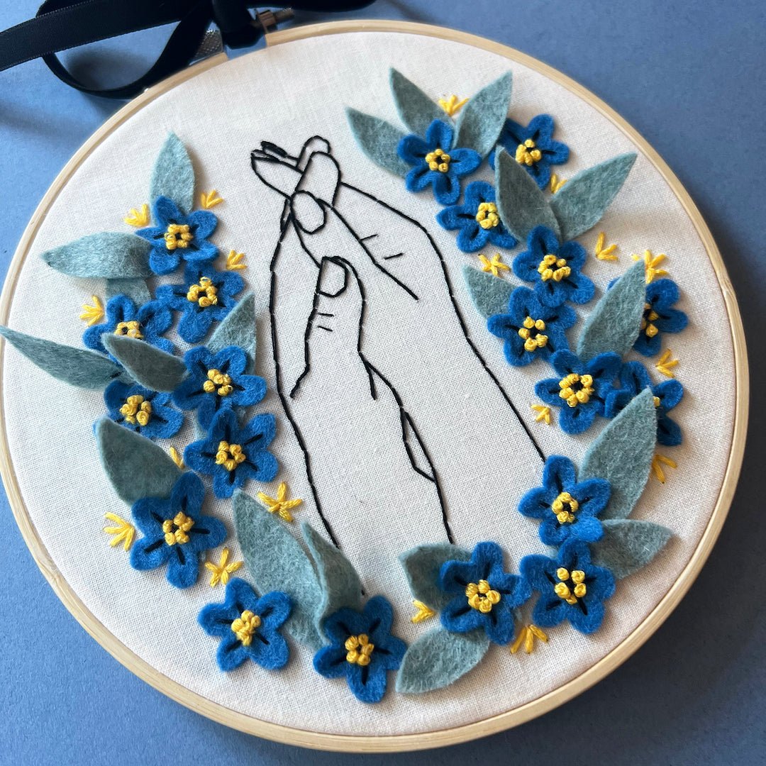 You will need: 7-inch embroidery hoop/ 11 inch cotton or linen square/ 7 inch felt square for backing/ 15cm squares, felts for flowers & leaves/ Embroidery threads
