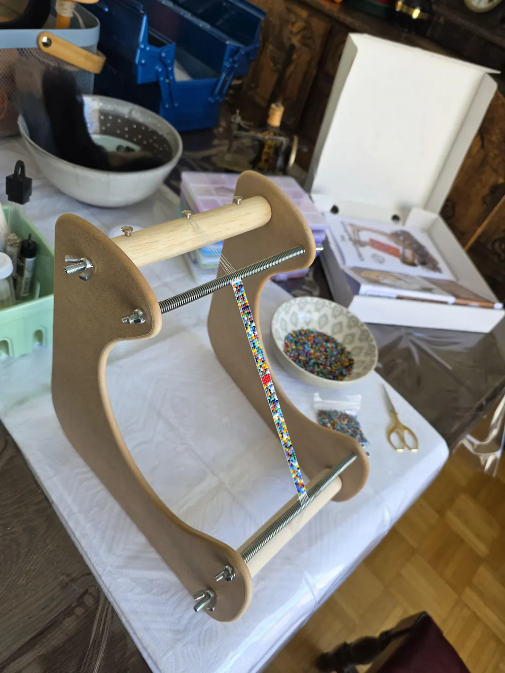 The Ultimate Bead Loom was created for all your beading weaving needs. The specially designed loom sits at a 45-degree angle, making it easier for the weaver to bead without fatigue. The kit comes complete with a thick MDF frame and hardware, warp thread, a sample pack of seed beads, beading needles, pattern sheets and blank pattern sheets for your own design. So get creative and start weaving today! Weaving area: 148x180mm, up to 86 warp threads.